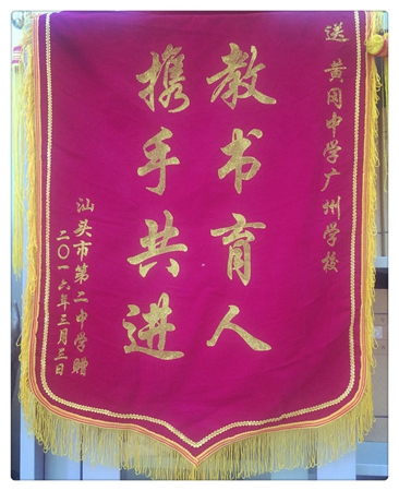 参观结束后,汕头二中校领导向我校敬赠锦旗,表示此行收获颇多,期望未来与广州市黄广中学的交流学习,一起携手共进,为广东省乃至全国的基础教育发展作出贡献。