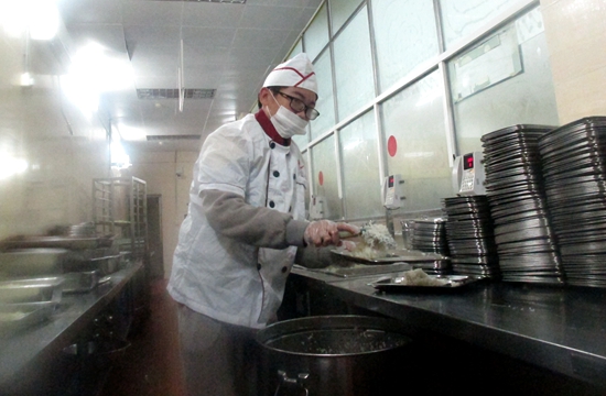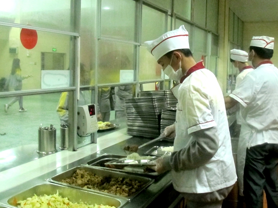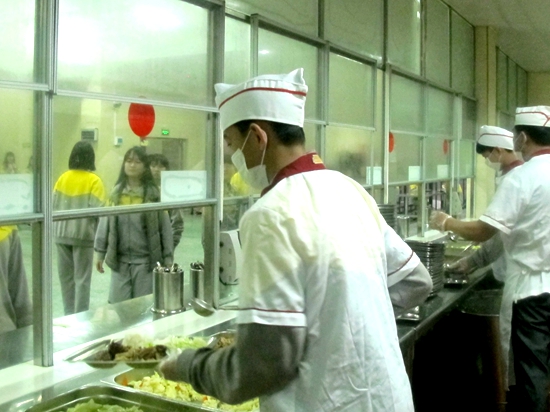 在富有经验的厨房“专家”指导下,“帮厨小队”开始工作:帮同学盛饭,看起来是食堂服务体系中最简单的劳动,但是盛饭分菜的过程中几乎难得休息,分发分量也有讲究,是食堂一日服务中不能轻视的过程。