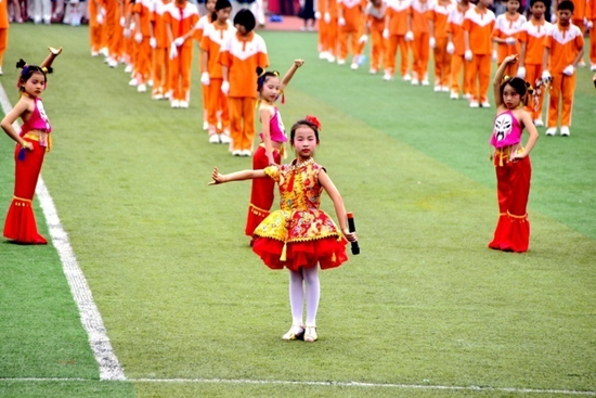 来自广州市黄广中学军参与本届盛典,灵动的小小舞者引领“红橙相间”的舞者队伍昂首阔步于绿茵场上,充满童趣却不失精彩的齐舞引发现场阵阵掌声。