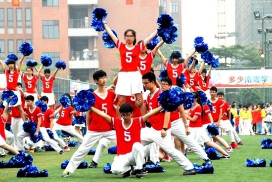 来自高中部的啦啦操隆重登场!沸腾的跳跃、舞蹈,洋溢着青春激情和对生活的热爱,向来宾们展示出黄广高中学子积极阳光的精神风貌和活力。
