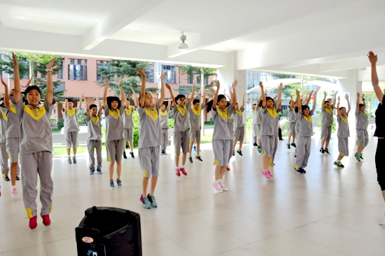 (图:《小苹果》集体舞蹈风靡一时,黄广体育教师引进校园并设为集体运动推广项目。)