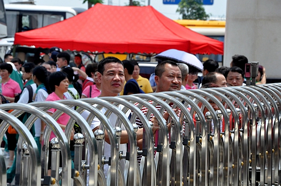 考试接近尾声,各方家长齐聚黄广考场门前,等待孩子。
