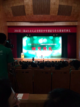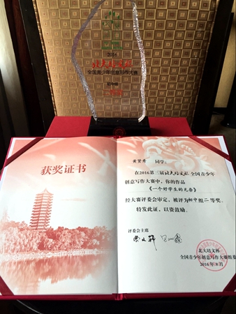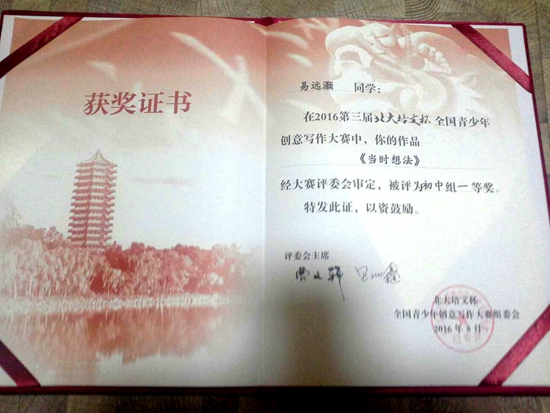 8月1日,全国第三届“北大培文杯”青少年创意作文大赛颁奖仪式在北京大学礼堂隆重举行,广州市黄广中学、陈星宇同学凭扎实的写作功底及出色的创意发挥,分别成功获得全国一、二、三等奖。