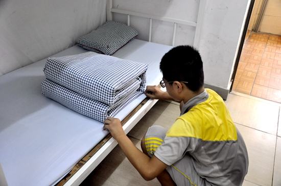 浸湿后背的汗水丝毫不影响学生整理被褥的专注——叠被子,讲究的是“严谨的角度”。