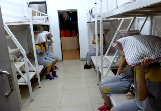 以软枕作为保护头部的缓冲工具,按照紧急指令迅速而有序地撤离室内场所,是夜间地震演习的重要体验内容。