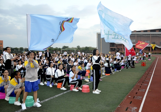 观众席上,极具班级文化色彩的旗帜在阵阵掌声与欢呼声中迎风飞扬。