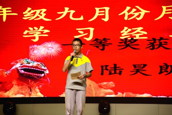八(2)班陆昊朗同学作为“进步之星”学生代表上台发言分享学习经验。陆同学以“晚自习的重要性”为发言中心,为大家分享自己高效利用晚自习并成功实现突破的真实经验,告诉大家思考与成绩的关系,让大家感到获益匪浅。