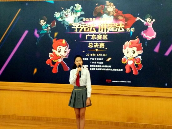 全国学生“学宪法,讲宪法” 演讲比赛广东赛区总决赛于2016年11月中旬在广州隆重举行,我校代表金小钰同学与来自全省各市中学选拔的优秀选手展开紧张而激烈的角逐。金小钰同学以主题突出的内容、语言清晰的表达、大气沉稳的台风获得现场评委们的一致好评,最终荣获广东赛区总决赛高中组第2名(广州高中学生获得该奖项仅3名)、荣获大赛二等奖,为广州市、花都区和黄广学校赢得了荣誉。