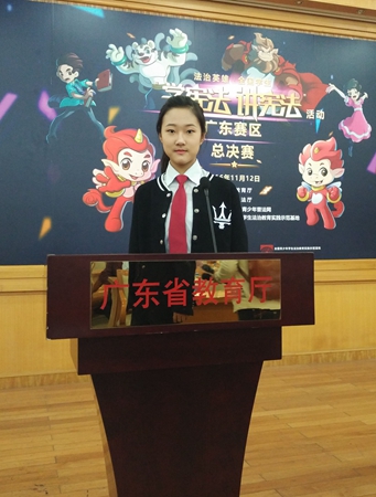 据悉,海选由各区教育局和高校按照小学、初中、高中、高校四个组别分别选拔2名选手参加市级初赛,海选过关的参赛学生还需经过市级初赛和省级复赛严格的视频初审,最终产生32名选手进入省级总决赛(小学、初中、高中、高校各组8名)。广州市黄广中学n>1)班金小钰同学以精彩的表现、稳定的发挥获评委全票通过,顺利晋级广东赛区总决赛。