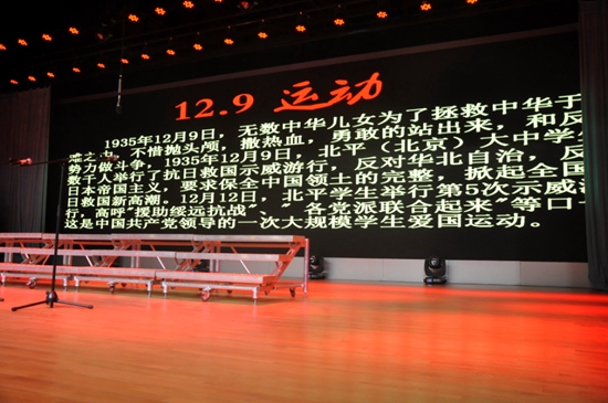 备注:【12·9运动:1935年12月9日,北平(北京)大中学生数千人举行抗日救国示威游行,反对华北自治,反对日本帝国主义,掀起全国抗日抗日救国高潮。12月12日,北平学生举行第五次示威活动,高呼“援助绥远抗战”“各党派联合起来”等口号,这是中国共产党领导的一次大规模学生爱国运动。】