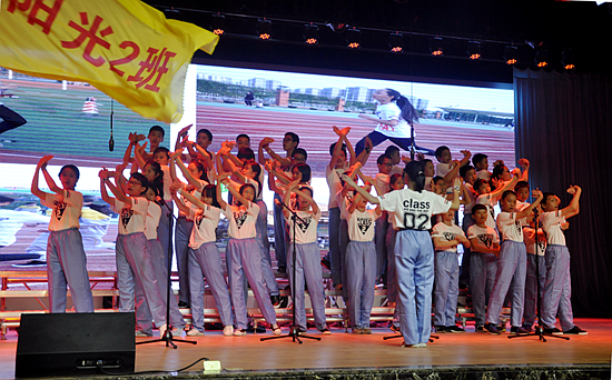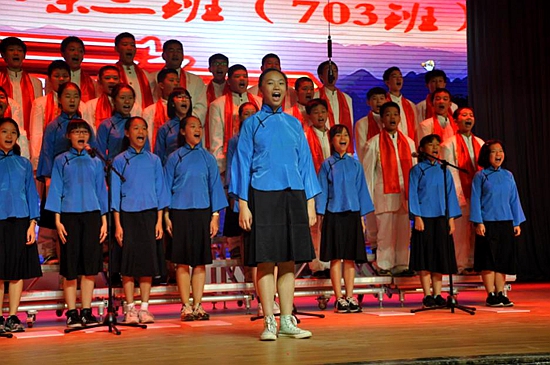 第一个班级合唱团队终于踏上舞台!身着具备班级文化色彩集体服装的小歌手们以朝气蓬勃的精神姿态为接下来的精彩汇演打响第一枪。