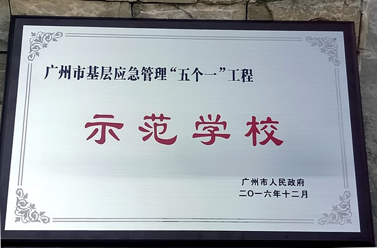 经广州市应急办审定,报广州市政府批准,授牌广州市黄广中学急管理五个一工程示范学校”。