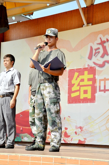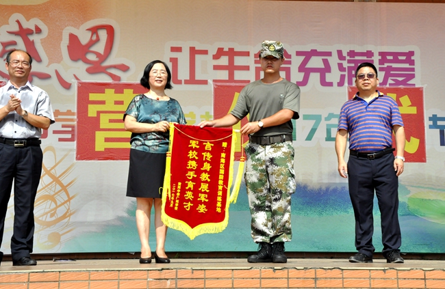 范小星校长代表学校向本次军训承训单位南海区国防教育训练基地的部队赠送锦旗,并就部队教官们连日来为学生提供高水平、高要求、高标准的锻炼与指导致以感谢,由军训团副总队长、杨呈少校代表接受赠旗。