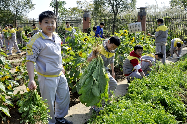 学生在学校专门设立的农耕体验基地进行劳动,学习农耕种植的系列技巧,收获“自己动手,丰衣足食”的体验与快乐。
