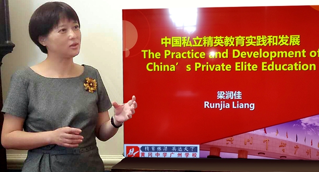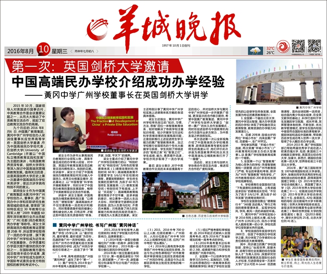 2016年8月,广州市黄广中学英国剑桥大学第一次邀请的中国高端民办学校代表,在英国剑桥大学以“中国私立精英教育实践和发展”为主题开设讲座,与国际教育专家、剑桥师生进行交流。