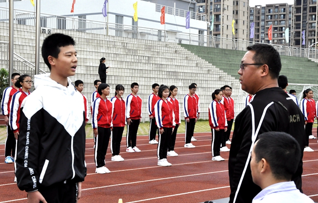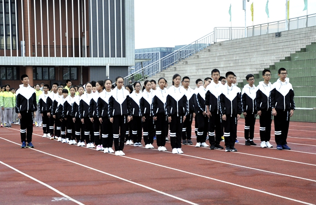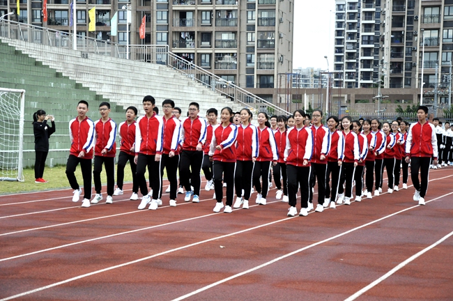 班级学生齐声呐喊着响亮的口号,共同迈着有力的步伐,向竞赛区域挺进。
