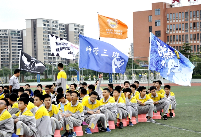 极具创意的各班集体旗帜迎风飘扬,彰显本班鲜明而独特的个性文化——比赛正式开始前,一场无声“较量”已在赛场上悄悄拉开帷幕。