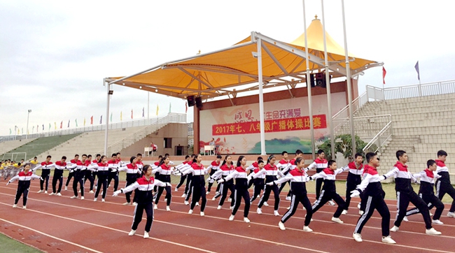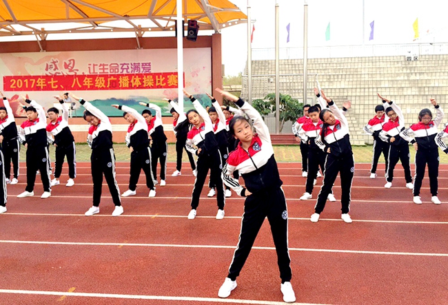为了提升学生健康商数,增强学生体质,督促学生通过常规的广播体操保持每日运动,鼓励学生多利用课余时间积极参与有益身心的运动,2017年11月,广州市黄广中学划、联合组织2017年广播团体操比赛,要求七、八年级每一位学生以班级为单位参加本次活动,以充满力量的伸展、跨步、跃动呈现黄广学子朝气蓬勃的精神风貌。