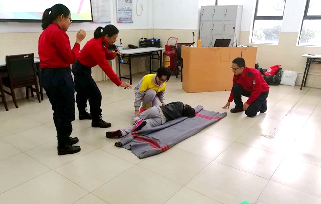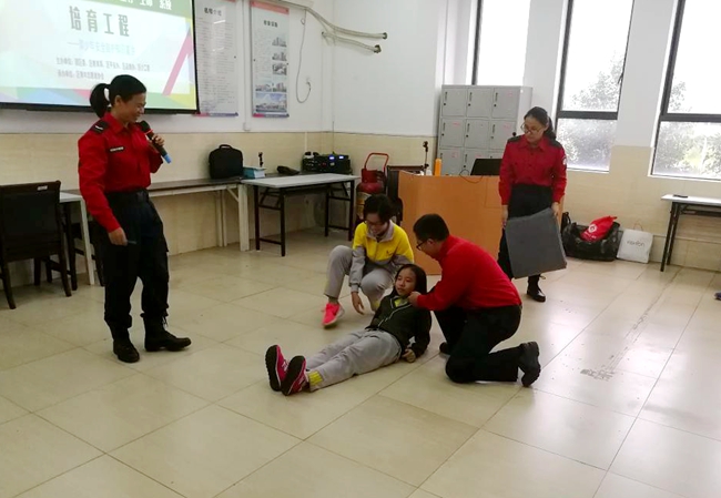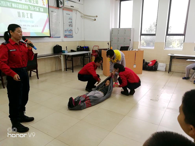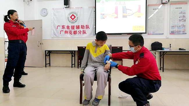 本次活动先后为学生开展了出血创伤包扎、紧急抢救法和校园防踩踏的示范培训。培训过程中,学生们积极参与到现场的示范互动,通过亲身体验学习专业人员示范指导的各项生命安全保障技能,无论是防踩踏疏散小演练,还是紧急抢救法现场实操,现场的实践性培训使学生们的安全自我防护知识和紧急抢救知识得到巩固和提升。