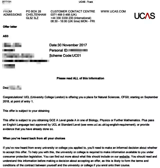 据悉,朱同学报读的是自然科学专业,只有符合严格条件:A2生物、物理或高等数学其中一门达到A,同时雅思总分6.5且各部不低于6的成绩,才能基本达到UCL该专业的录取标准。