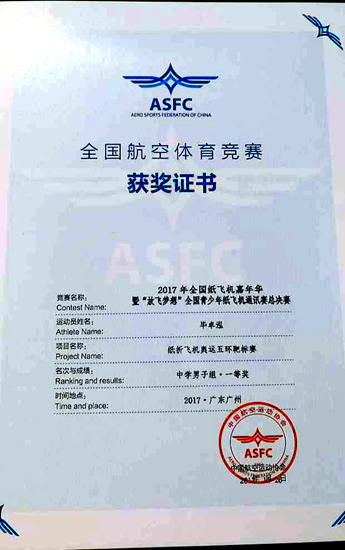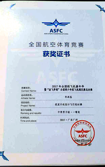 据了解,毕卓泓同学此前在广州市“放飞梦想”纸飞机比赛中脱颖而出,以广州市一等奖第一名得到进军全国决赛的资格。