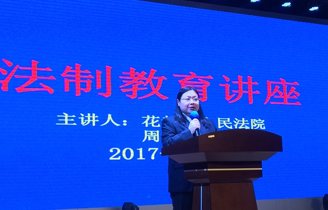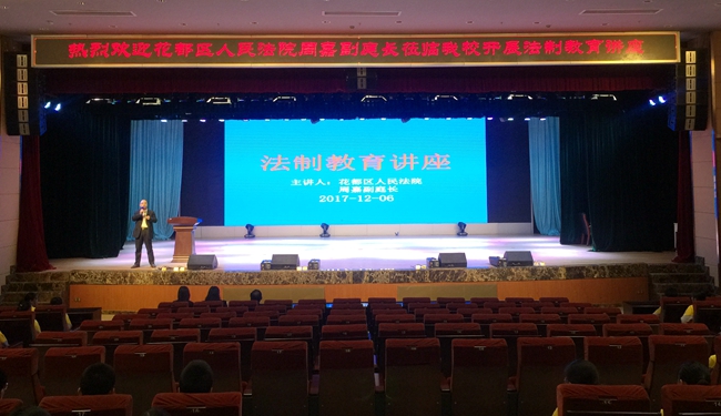 2017年“12·4”国家宪法日暨全国法制宣传日刚刚结束之际,为进一步增强我校学生的法制意识和遵纪守法的自觉性,培养学生“法律底线”这一人生之车的制动系统,12月6日,广州市黄广中学)邀请花都区人民法院周嘉副庭长为八年级师生开展法制教育讲座。周嘉副庭长于2014年受聘担任黄广学校法制副校长,多次参与学校策划组织的法律常识普及、模拟法庭教育等学生教育活动。学校杨文化校长助理出席本次法制教育专题讲座。