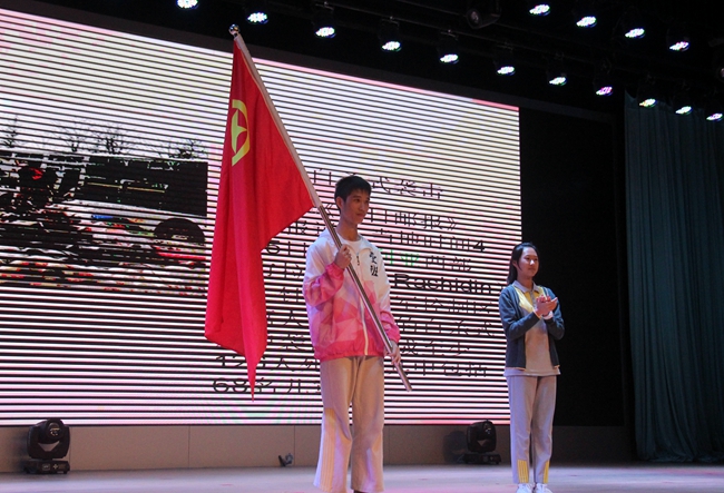 学生会换届交旗仪式中,金小钰同学作为16届学生会代表,将沉载着几代学生会光荣记忆与不变信仰的大旗交于2017届主席张子豪的手中。