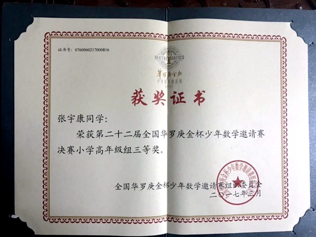 据悉,这已不是张宇康同学第一次参加“华杯赛”。在小学6年级时,张同学就曾经进入第二十二届“华杯赛”决赛,并取得了小学高年级组三等奖的好成绩。