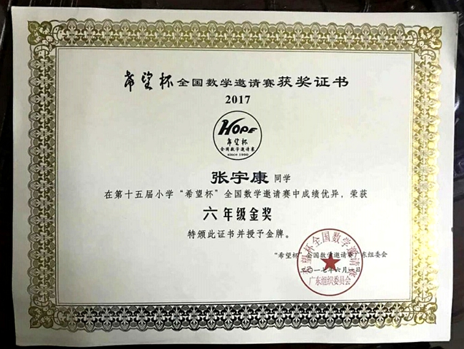 此外,在第十五届“希望杯”小学数学邀请赛中,张宇康也凭过硬的数学学科功底,再一次脱颖而出,荣获六年级金奖,优异的竞赛成绩也同时对张同学身为“数学学霸”的超强实力作出了权威认证。