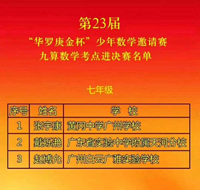 2017年12月13日,第23届“华罗庚金杯”少年数学邀请赛九算数学考点正式公布晋级决赛的选手名单,广州市黄广中学)七年级(11)班张宇康同学凭扎实的基础、稳定的发挥成功挺进决赛。