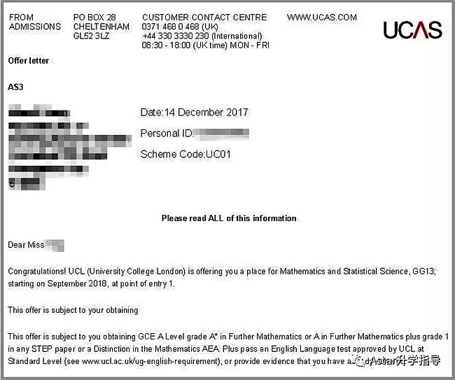 这次收到的offer是来自于伦敦大学学院(UCL)的数学和统计专业。该专业要求学生 Further Mathematics(高阶数学)达到 A*,或者Further Mathematics达到A 的成绩,同时加考STEP考试并达到1等级成绩,方能达到录取标准线。