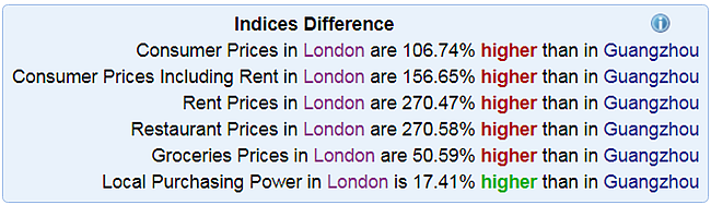 Average net salaries per month in London hover around 20,000 CNY compared to Guangzhou’s 7,000 CNY. The London figure itself may be shocking to readers already. UK citizens do not earn as much as you may expect. But what importance does salary hold without spending?