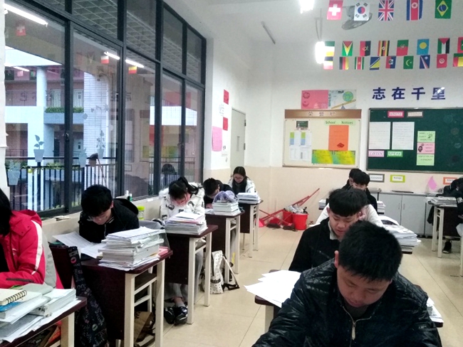 英语能力对于将要走出国门求学深造的国际部学生是极其重要的基本,国际部学生接触的英语词汇、英语应用技能等比国内普通班的难度大,需要争分夺秒地消化、训练。图中,国际部学子利用早自习时间训练英文阅读。