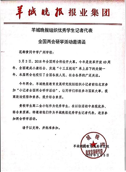 《羊城晚报》特别邀请金小钰作为优秀学生记者代表,走进2018全国两会(邀请函)