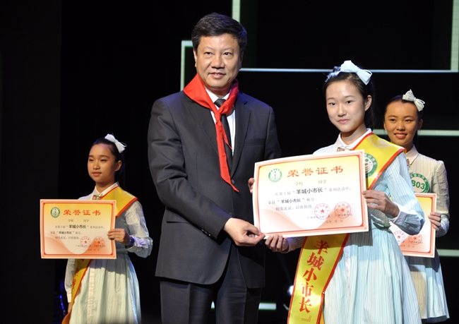 全国人大代表、广州市人大常委会主任兼党组书记陈建华(时任广州市市长)为金小钰同学授予荣誉证书。