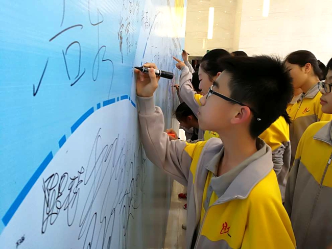 学生们有序进入会场,并纷纷以“活动贵宾”的架势在专门设置的心愿墙上挥洒笔墨、留下大名。