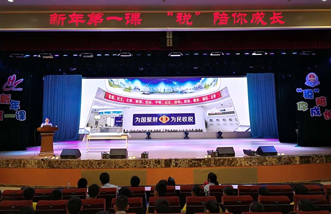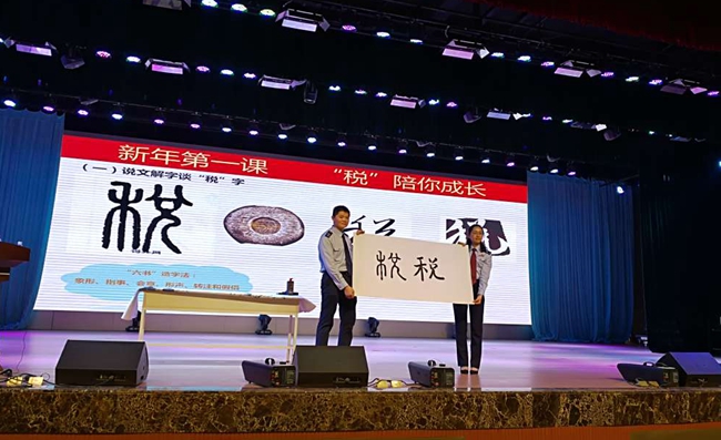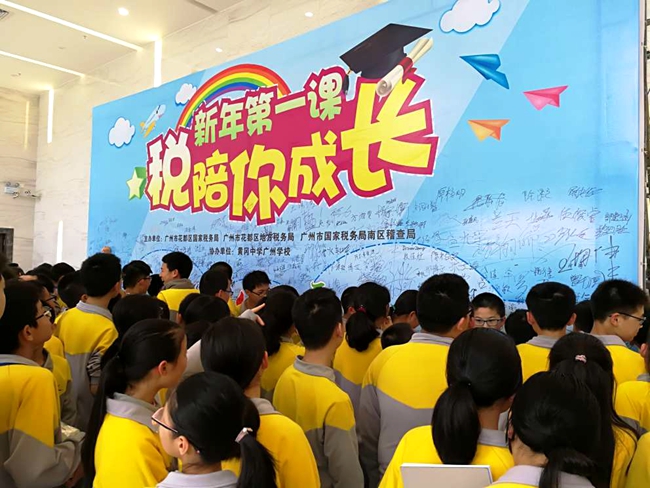 2月28日下午,花都区国税局、花都区地税局、市国税局南区稽查局联合主办以“新年第一课‘税’陪你成长”为主题的税务进校园的活动,在广州市黄广中学。