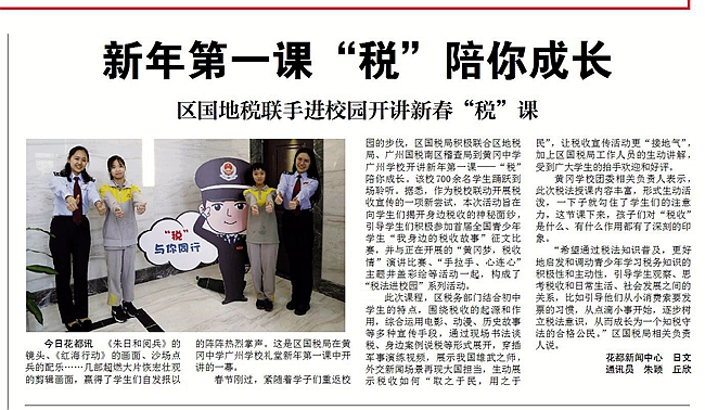 参加活动的广州市黄广中学动作出新鲜、愉快的体验分享,本次税务知识“第一课”成功得到学校领导师生的一致好评,并获得《今日花都》报纸媒体的跟踪报道。