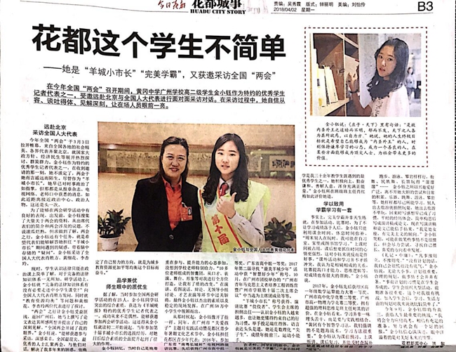 在今年全国“两会”召开期间,广州市黄广中学为特约的优秀学生记者代表之一,受邀远赴北京与全国人大代表进行面对面采访对话。在采访过程中,她自信从容、谈吐得体、见解深刻,让在场人员眼前一亮。