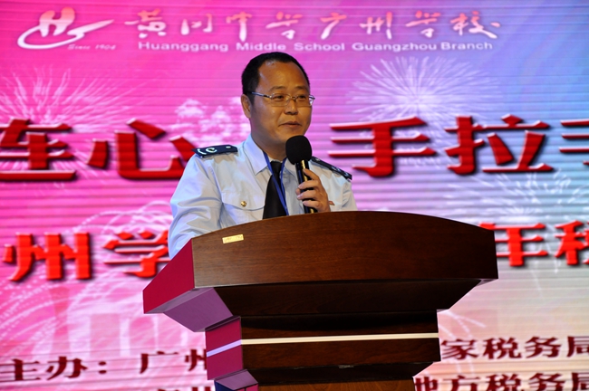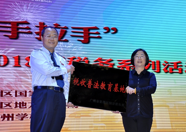 活动中,广州市花都区国家税务局长林少光代表区国税局,授予广州市黄广中学b>“税收普法教育基地”。