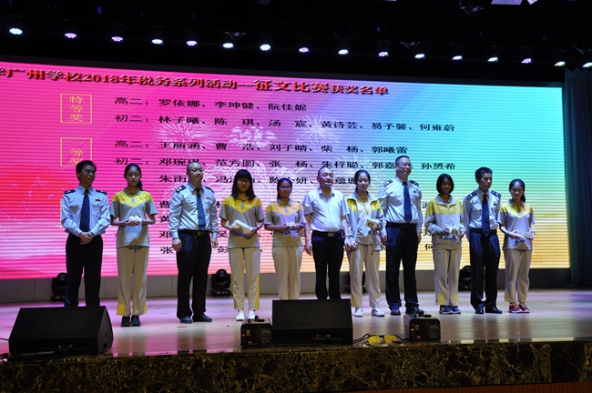 2017-2018学年,黄广学校组织举办了“我身边的税收故事”征文比赛、“税收情·中国梦”演讲比赛、“税”主题井盖彩绘等比赛活动,吸引全校逾3000学生参加相关活动,并有457位学生以优秀的作品、亮眼的表现得到活动专家评委的肯定,在三大主题活动中获得不同等级的表彰,更由林少光局长、孙国文局长等领导亲自向获奖学生授予荣誉。