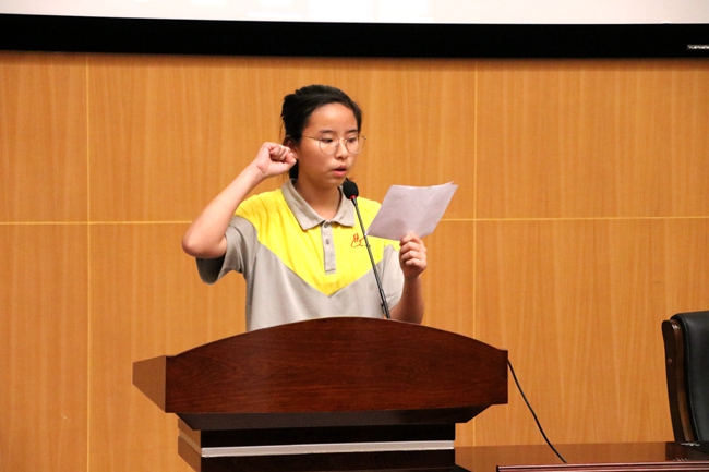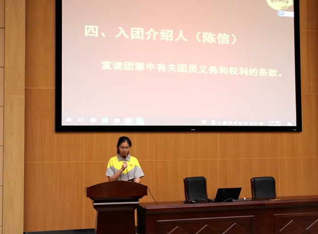 2017年首批团员代表兼学生会副主席的陈信同学,为新团员宣读《团章》中有关团员义务和权力的条款,并及时作出条文解读。