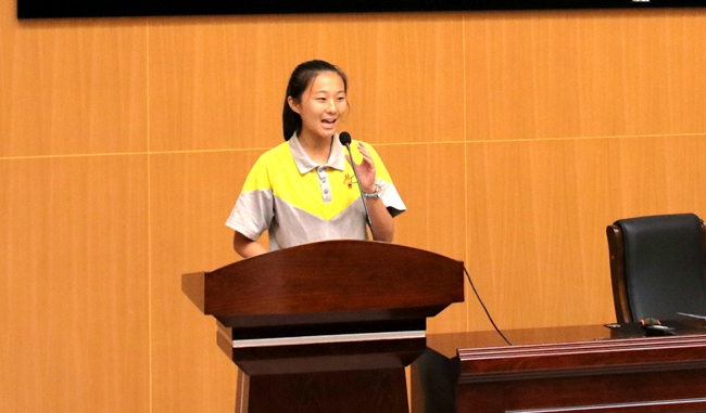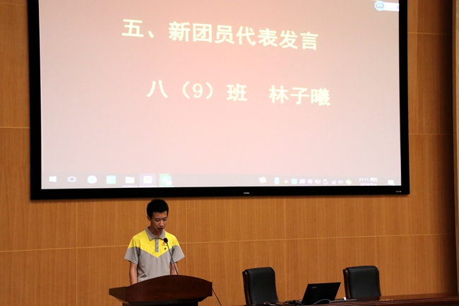 八(9)班林子曦代表全体新团员向所有学校领导、老师和同学们致以感谢,同时表明将在今后的学习生活中,更严格地要求自己,从《团章》的系列条文规定出发,进行自我管理、自我约束,维护共青团的尊严,树立共青团的威信。