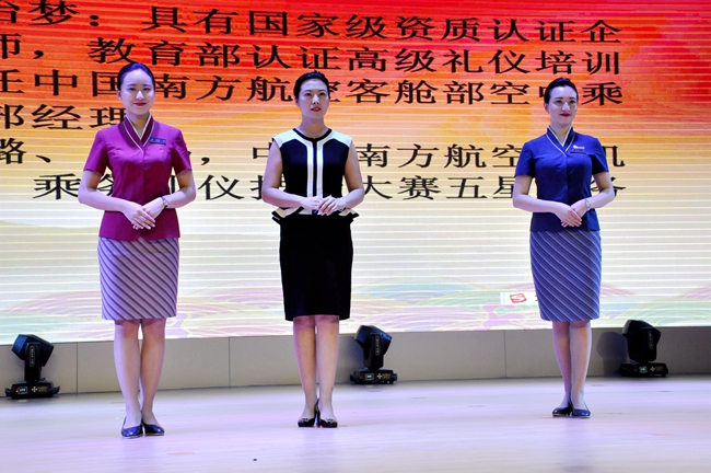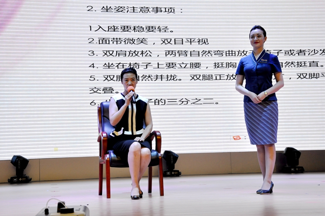 中国南方航空客舱部空中乘务管理部经理孙怡梦女士(具有国家级资质认证企业培训师,教育部认证高级礼仪培训师),中国南方航空专机组成员程璐女士、何畅女士(中国南方航空专机组成员,乘务礼仪技能大赛五星乘务员)受邀担任本次主题讲座的主讲嘉宾,从现代人的言谈举止等方面文明礼仪为学生进行生动有趣的讲授示范。