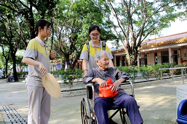 近日,广州市黄广中学团委组织学生会义工部优秀学生代表、优秀团员代表前往雅瑶敬老院,以贴心服务向老人传递关爱。