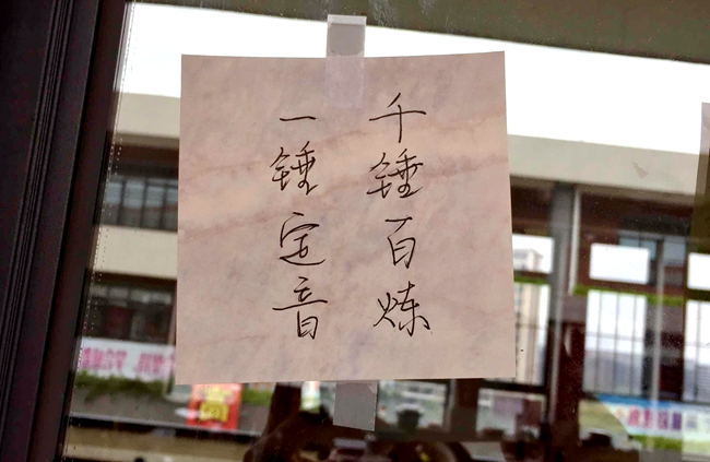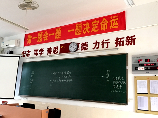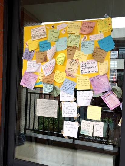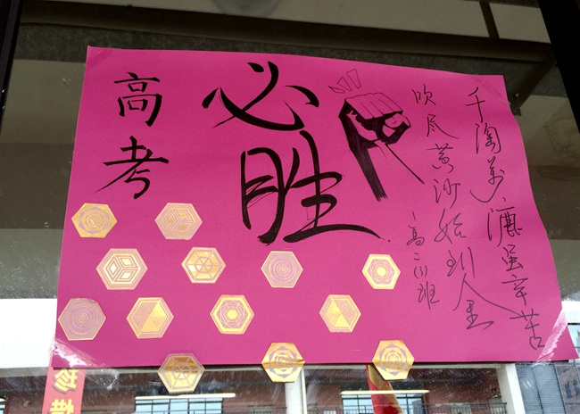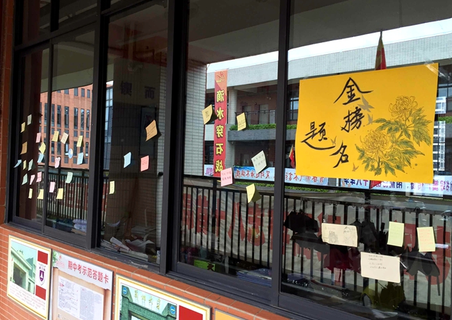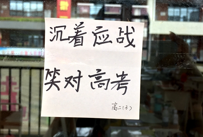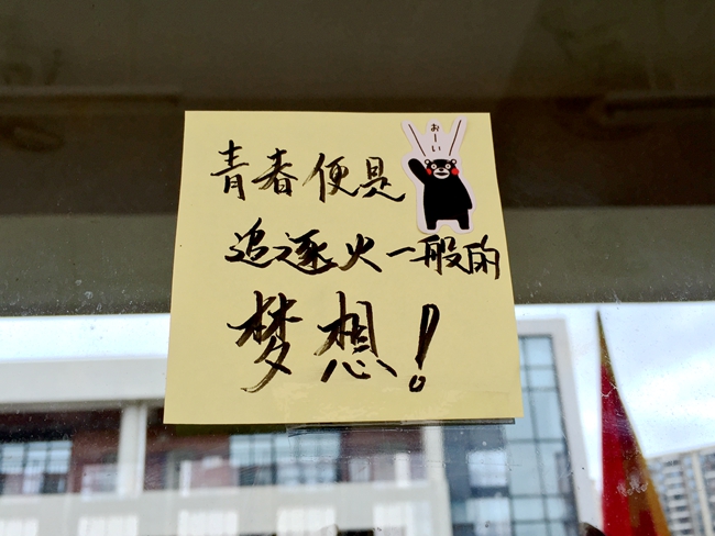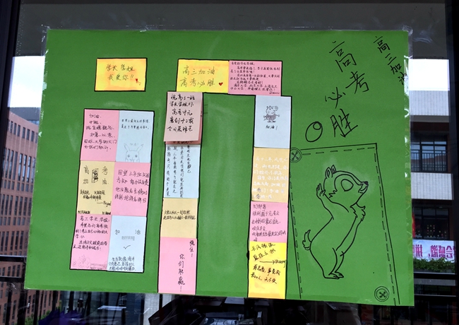 班级窗户上,决战高考、突破自我的豪言壮语附着在一张张小纸条上,成为高三教学区一道奇妙的风景。