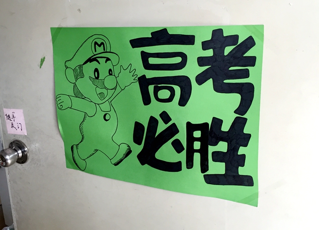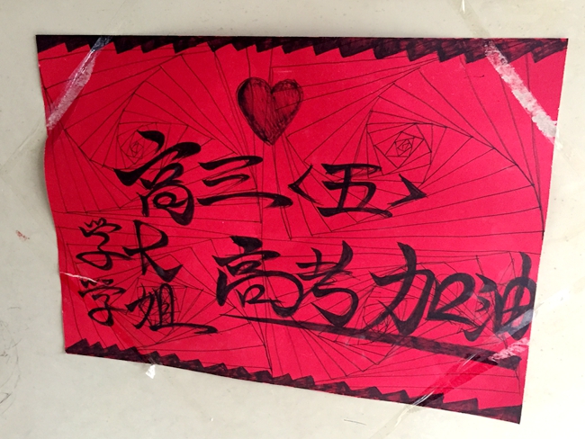 学弟学妹们亲自制作“金榜题名”“高考必胜”“高考加油”的大字海报,张贴在高三年级不同教室门窗前。