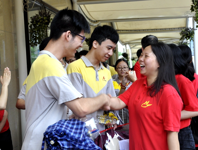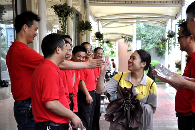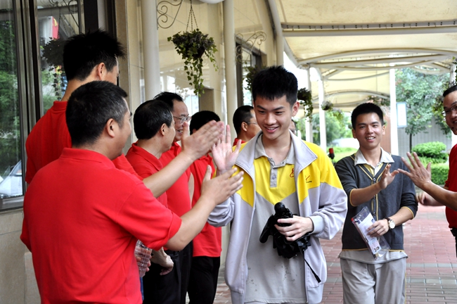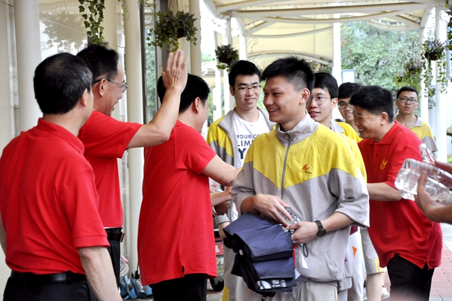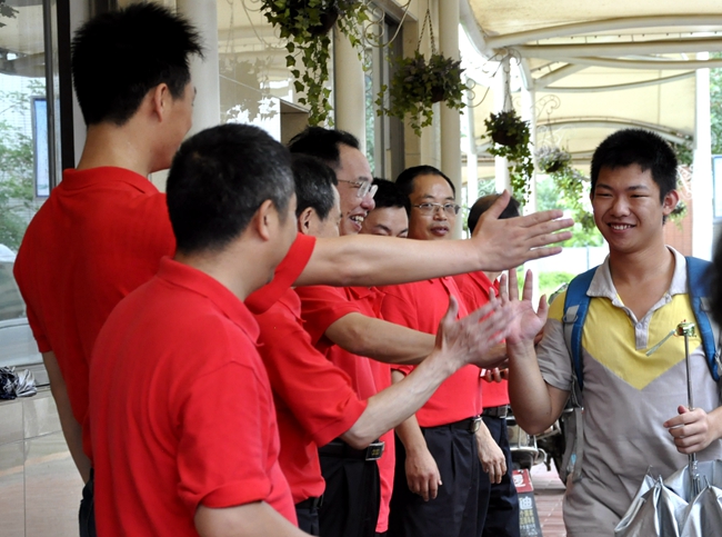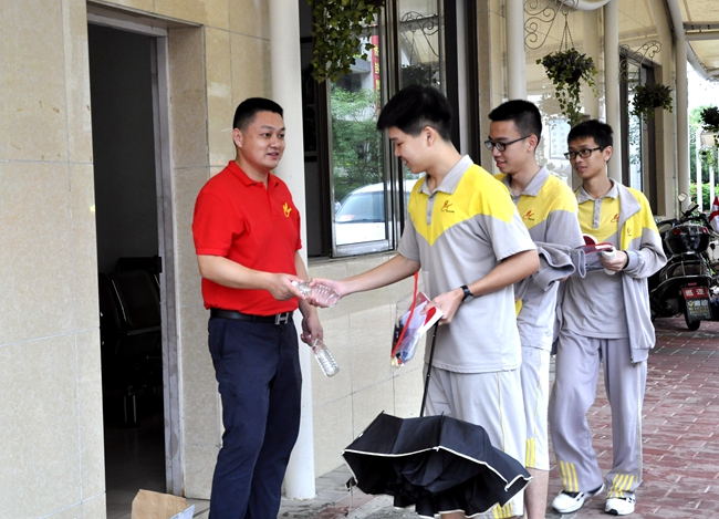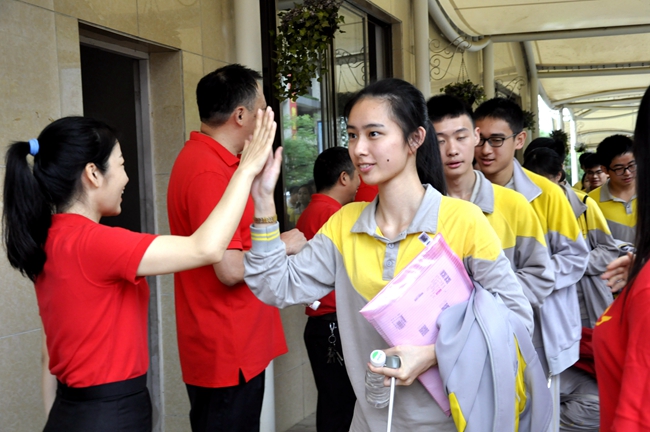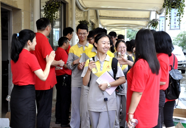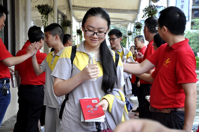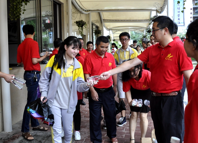学生们接过老师亲自递来的水,以灿烂的笑颜向老师展示饱满的信心。
