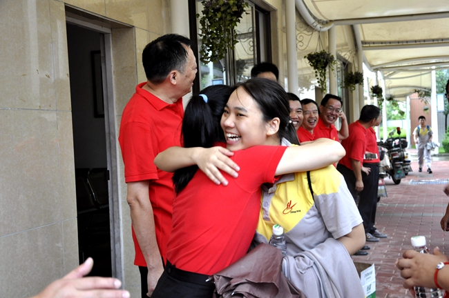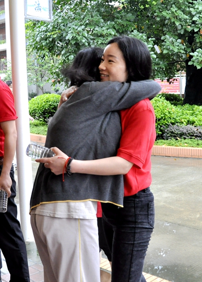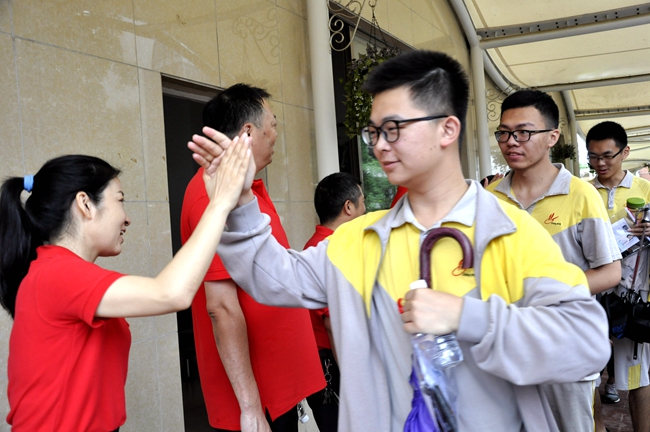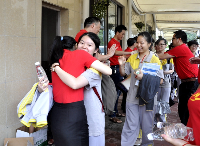 老师一边拥抱即将步入考场的学子,一边向每位学生进行考前的叮嘱与提醒。