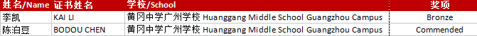 广州市黄广中学下学校,简称黄广学校)国际部李凯同学凭超卓的学科水平成功突围,荣获大赛铜奖(Bronze),陈泊豆同学也以优异的个人表现获得入围奖(Commended)。